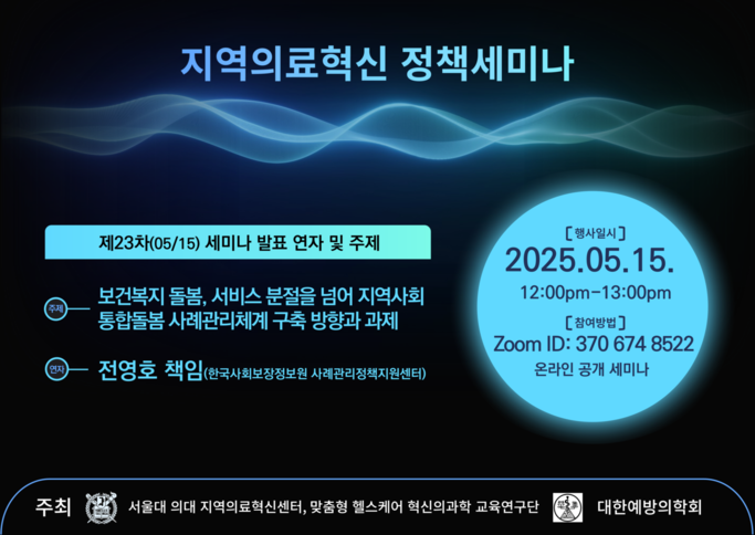 주최: 서울대 의대 지역의료혁신센터, 서울대 의대 맞춤형 헬스케어 혁신의과학 교육연구단, 대한예방의학회